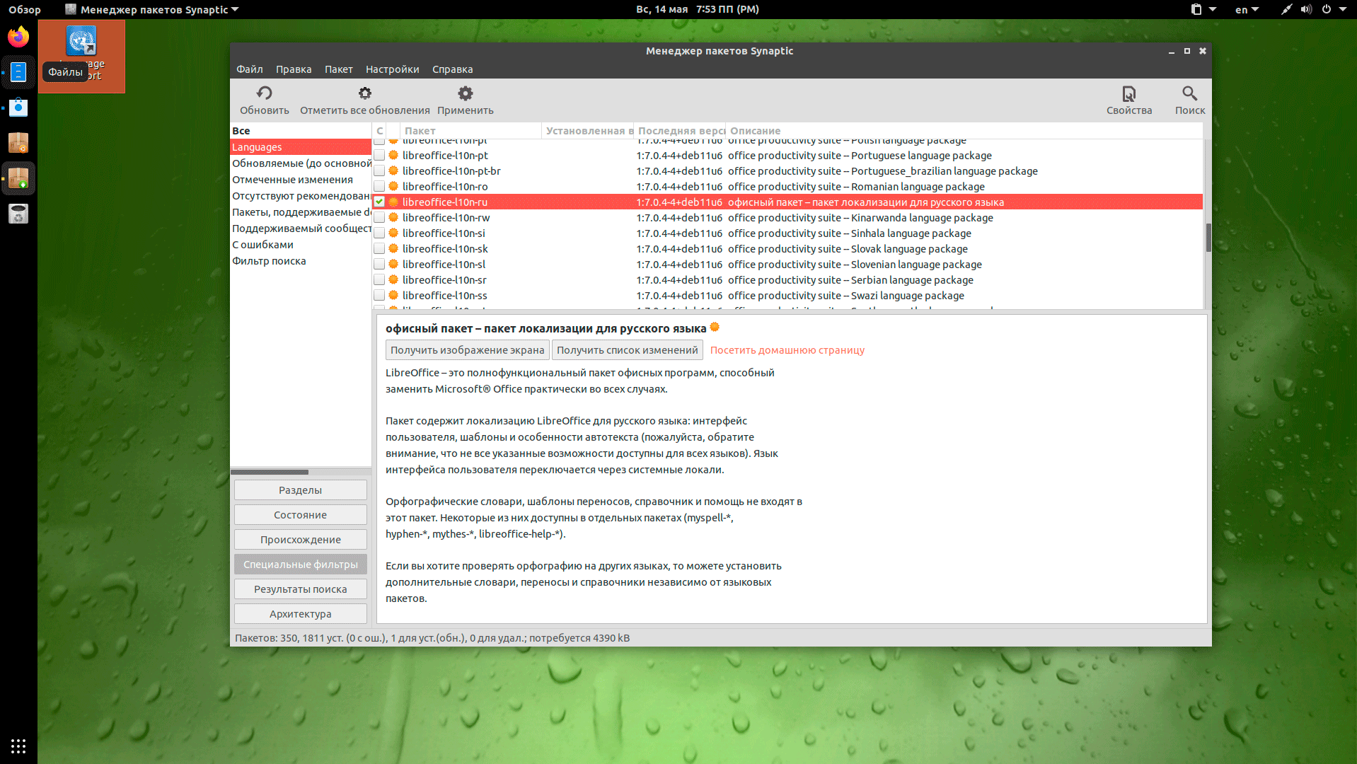 В этом случае будут установлены все недостающие пакеты русификации, а также словари для поддержки проверки орфографии на русском языке.