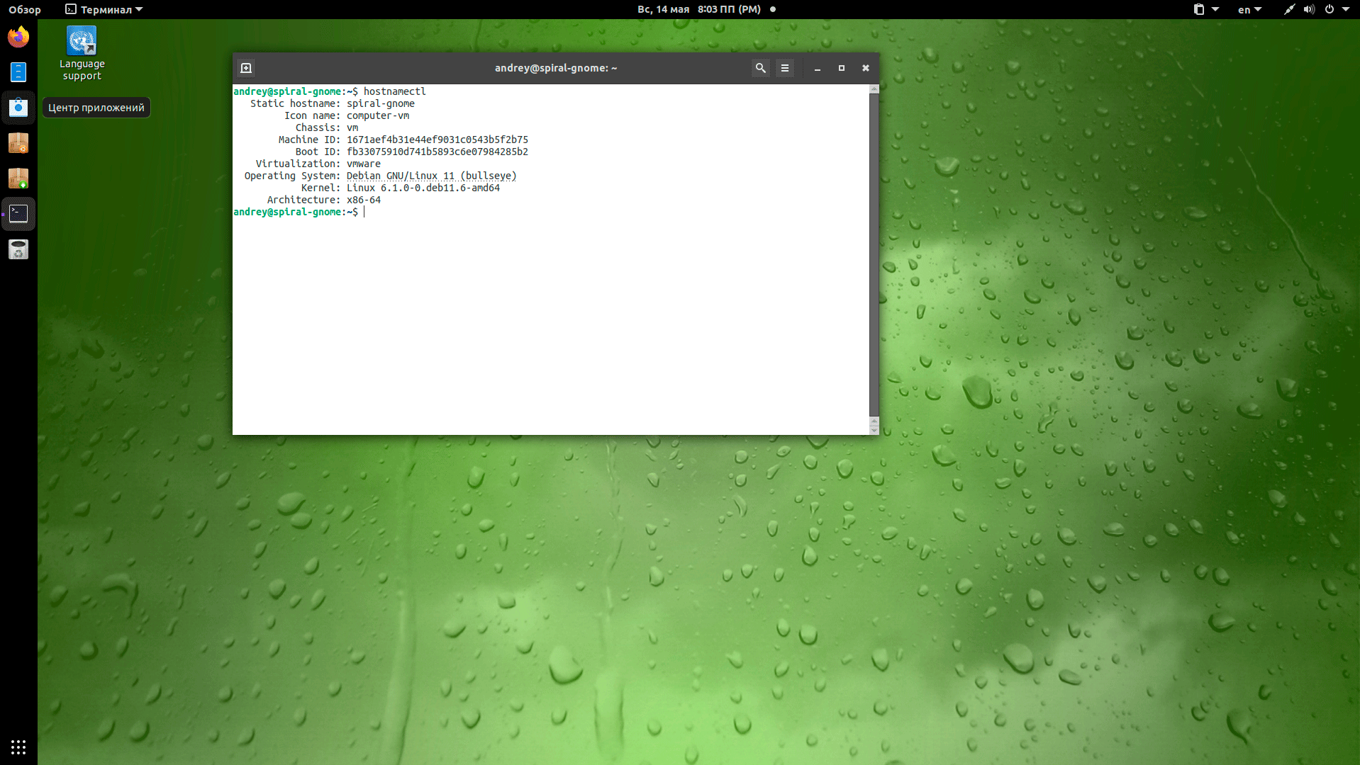 После перезагрузки нас встречает рабочий стол Gnome настроенный по образу и подобию Ubuntu: сразу закреплена панель и включены файлы на рабочем столе. В таком виде Gnome гораздо удобнее, нежели его "ванильная" версия.