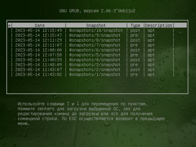 - Файловая система btrfs со сжатием zstd и снимками, на которые можно откатиться через GRUB