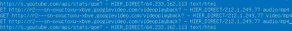 Теперь открываем /var/log/squid3/access.log и ищем записи, соответствующие нашему посещению. Лучше всего делать это когда нагрузка на сеть невелика. Обращаем внимание на тип содержимого в конце строк, в котором будет интересующий нас MIME-тип. Таких в данном случае два: audio/mp4 и video/mp4.