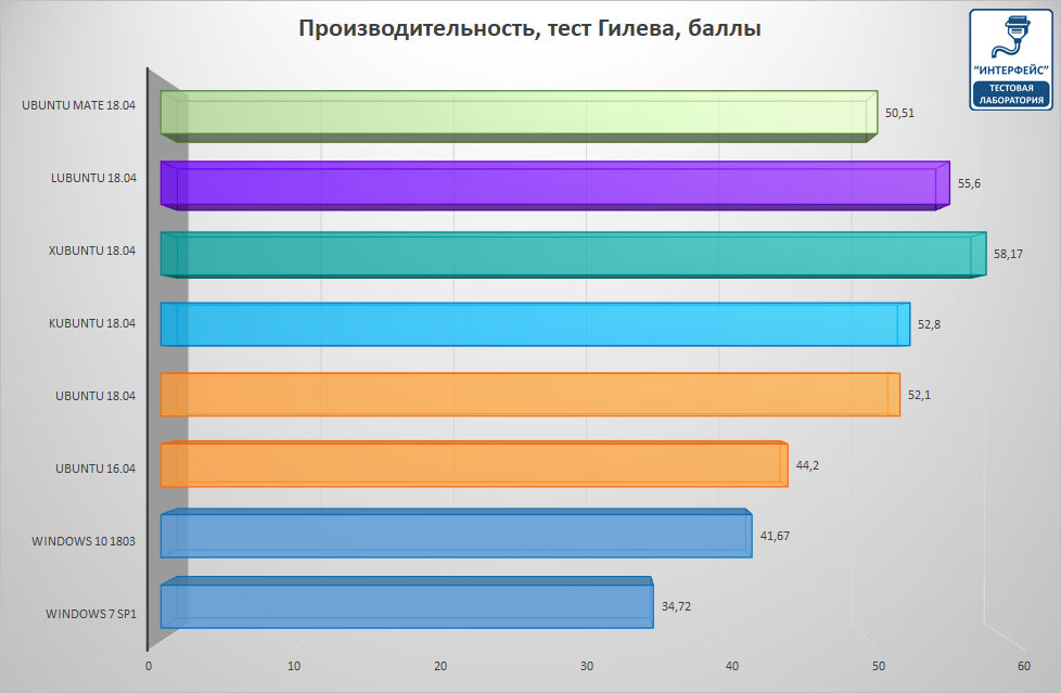 Несмотря на то, что XFCE (рабочая среда Xubuntu) считается достаточно легковесной, мы протестировали совсем "легкий" дистрибутив Lubuntu c LXDE, результат несколько уступил лидеру, но несколько опередил основные "тяжелые" дистрибутивы.