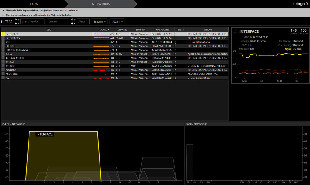 Как видим диапазон 2,4 ГГц достаточно сильно загружен, несмотря на это нам удалось выбрать наиболее свободный участок диапазона, разница в уровнях с ближайшими сетями составляет около 40 dB. Диапазон 5 ГГц девственно чист, что объясняется малой распространенностью и довольно высокой ценой оборудования.