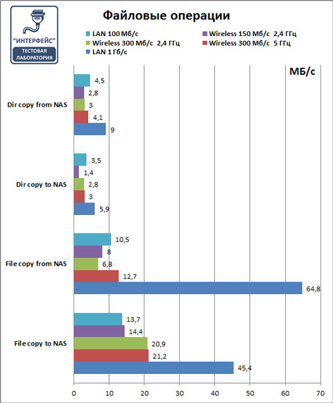 В качестве тестового пакеты мы использовали Intel NASPT 1.0.7работающий в среде Windows 7 64-бита. Чтобы проверить различные режимы работы мы подключались к беспроводной сети через недорогой адаптер TP-Link TL-WN725N, обещающий скорость до 150 Mбит/с и через двухдиапазонный адаптер TP-Link TL-WDN3200, относящийся к верхней ценовой категории и поддерживающий скорости до 300 Мбит/с. Также мы протестировали два варианта проводного подключения со скоростями 100 Мбит/с и 1 Гбит/с.