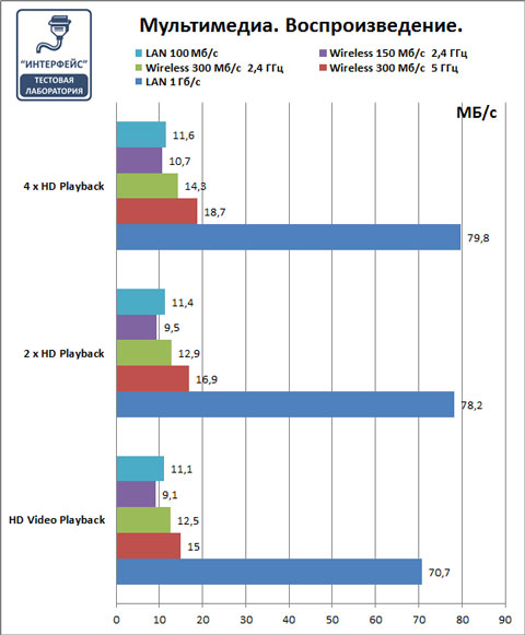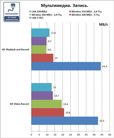 Подключения 150 Мбит/с незначительно уступает 100 Мбит/с проводному соеднинению, а 300 Мбит/с незначительно превосходят, здесь еще более видна разница между диапазонами, 5 ГГц производительнее.