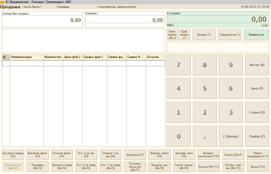 Если мы глянем на интерфейс рабочего места кассира (РМК) в 1С:Розница, то увидим, что каждому действию соответствует определенная клавиша или комбинация клавиш. Это позволяет запрограммировать клавиатуру сразу на выполнение определенных действий, упростив таким образом работу с программой.