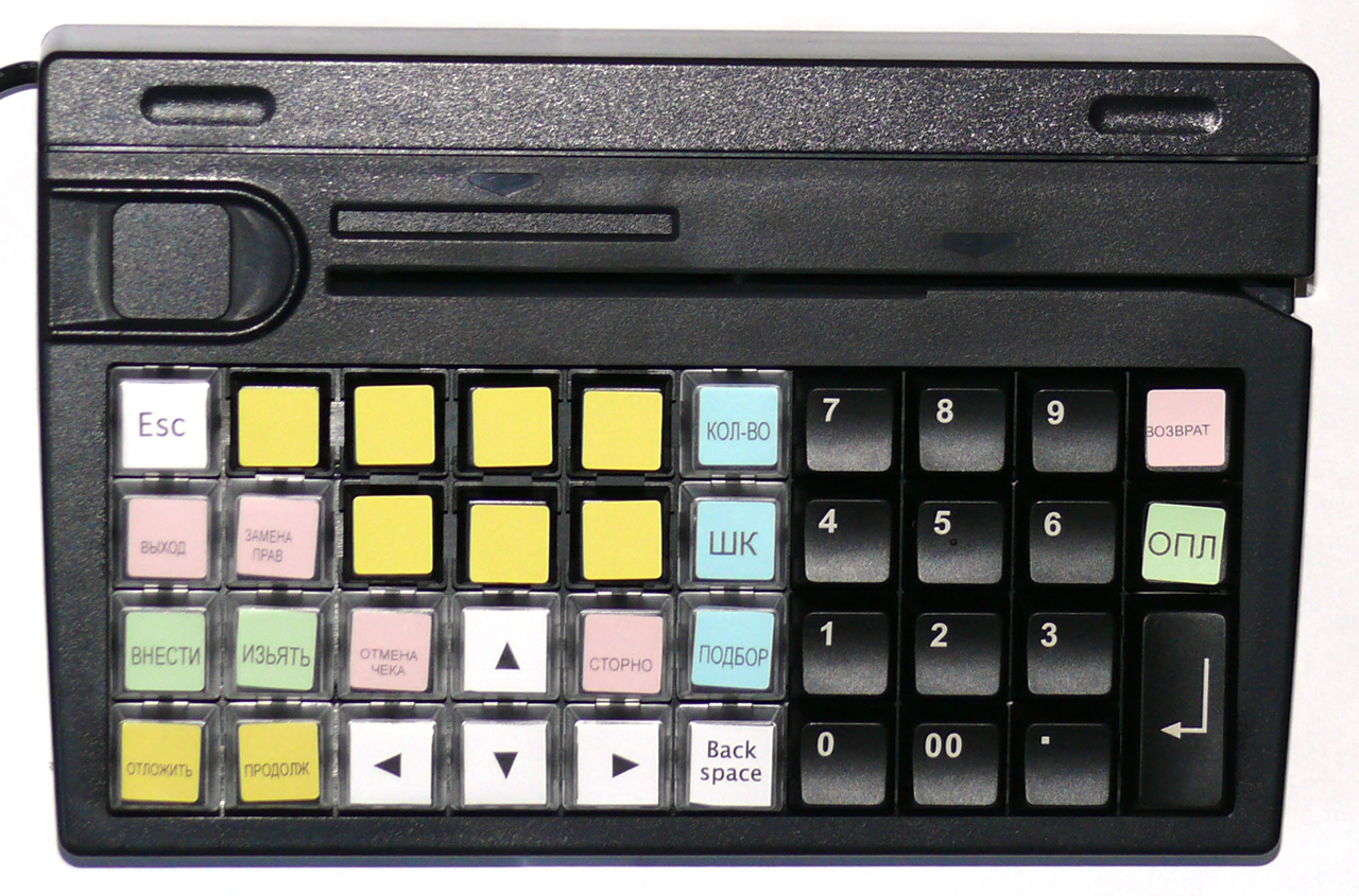 Прежде всего о том, что такое программируемая клавиатура и для чего она нужна. Это - специализированное устройство ввода, которое, в отличие от обычной клавиатуры, позволяет программировать раскладку клавиш произвольным образом. Причем на каждую клавишу можно назначить не только отдельный символ, но и комбинацию символов, что позволяет одним нажатием вводить клавиатурные комбинации, соответствующие определенным действиям в интерфейсе кассира.