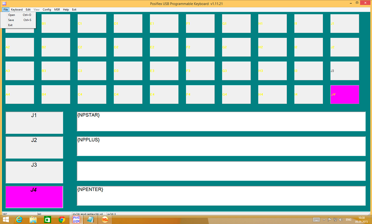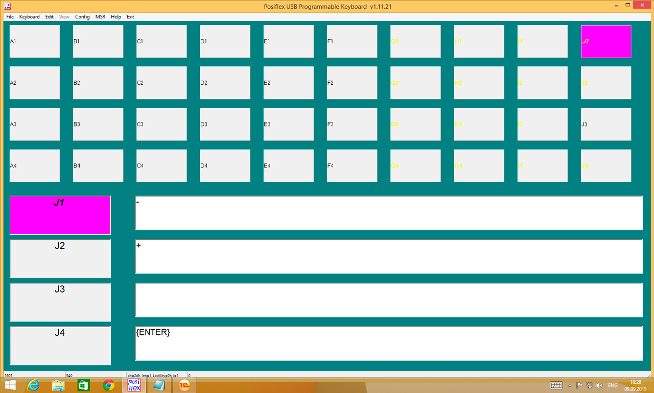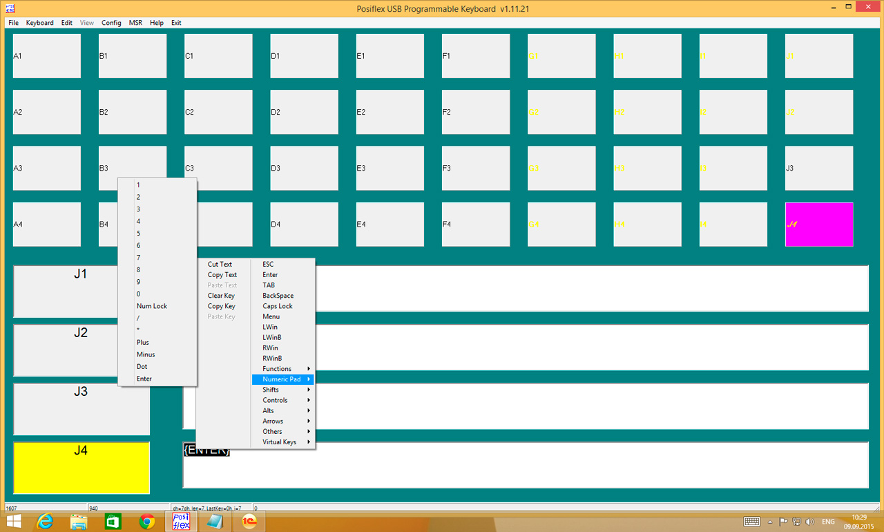 По умолчанию в данной клавиатуре запрограммирован цифровой блок, на скриншоте выбран крайний правый столбец J в котором имеется сдвоенный ENTER и клавиши "+" и "-". Теперь внимание! В РМК "+" соответствует кнопке Оплата, но если мы оставим все как есть, то данная клавиша работать не будет. Почему? Ответ прост, 1С:Розница использует клавиши с NUM-блока клавиатуры, а запрограммирован обычный "+", который имеет иной клавиатурный код, нежели "Num+".