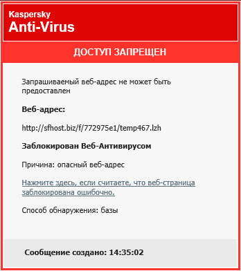 Лидер российского антивирусного рынка не подвел, вредоносное ПО сбивается еще на подлете, блокируется сама попытка перейти по фишинговой ссылке: