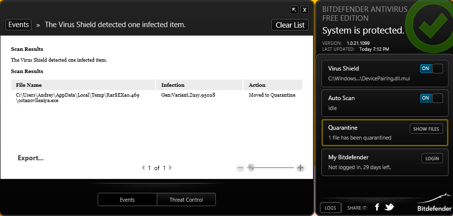 Особой популярностью данный бесплатный продукт у нас не пользуется и результат данного теста ее явно не добавит. Наши образцы вредоносного ПО оказались полностью неизвестны этому антивирусу.