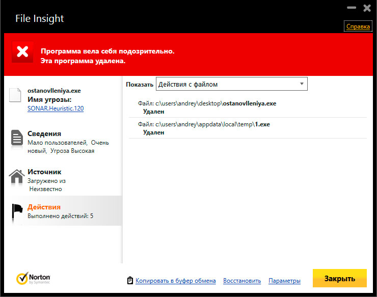 Norton - самый популярный зарубежный производитель антивирусного ПО, однако в данном случае он оказался не на высоте, детекта вредоносного ПО не произошло и при попытке его запуска мы получили только неуверенные рекомендации от поведенческого анализатора.