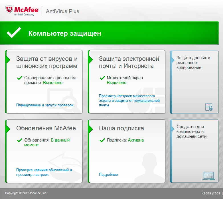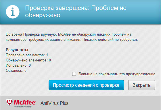 Продукты McAfee некогда были довольно популярны, сегодня они чаще всего встречаются предустановленными на готовых ПК зарубежных производителей или в виде полугодовых карт в комплекте с некоторым оборудованием. В данной ситуации антивирус, если цитировать его же сообщение, "проблем не обнаружил".