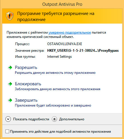 Никаких рекомендаций, в отличие от Norton нам не дают, предоставляя догадаться самим, какое решение принять. Если исходить из худшего сценария и нажать Разрешить, то никаких действий более не последует. Троян-загрузчик пропишется в системе, при этом Trojan.Encoder.293 был определен и блокирован.