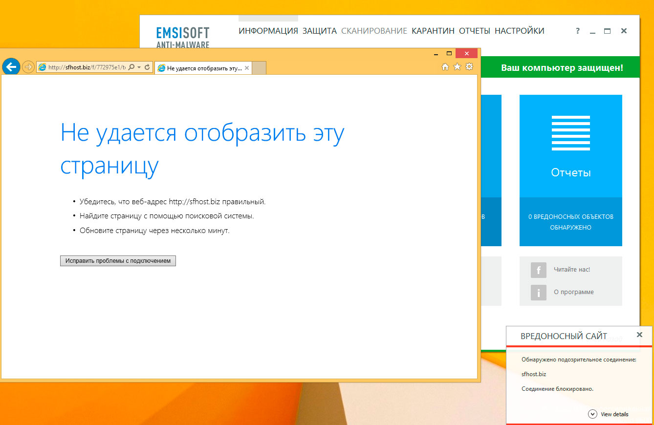 Еще один новичок нашего тестирования, набирающий популярность австрийский антивирус, сочетает в себе антивирусный движок Bitdefender и собственный антишпион. Уже отталкиваясь от движка можно заранее предсказать результат. Emsisoft Anti-Malware уверенно блокирует доступ к фишинговому сайту, практически не оставляя способа быстро обойти запрет: