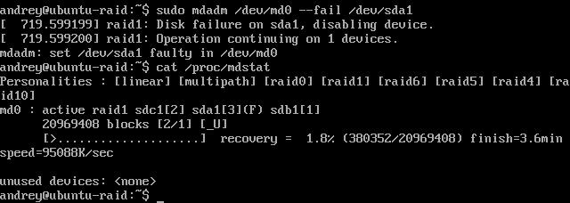 Под критическим отказом понимается ситуация, когда жесткий диск полностью вышел из строя. В этом случае определяем название отказавшего диска при помощи mdstat и производим его замену, далее порядок действий полностью аналогичен предыдущему пункту.
