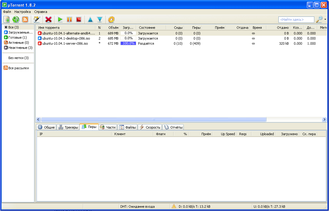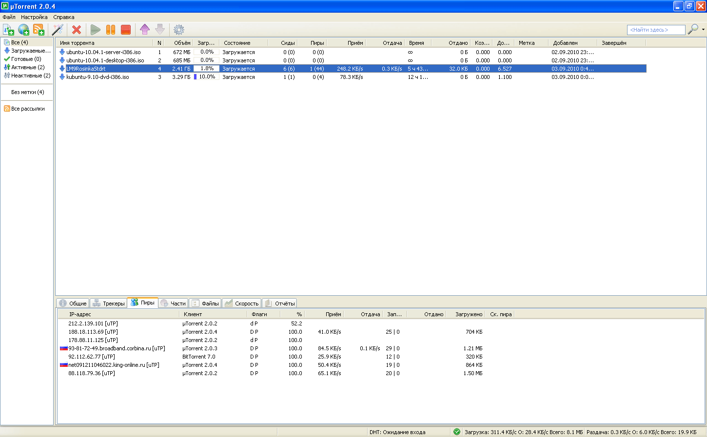 Мы не будем останавливаться здесь на подробностях установки xtables-addons, это тематика для отдельной статьи, нас же более интересуют результаты. Модуль ipp2p умеет распознавать различные виды p2p трафика, что позволяет указывать для них отдельные правила в iptables. Попробуем заблокировать торренты. В нашем тестировании приняли участие две версии клиента uTorrent: более старая 1.8.2 и новая 2.0.4. Основным отличием версии 2.х является поддержка протокола uTP, также оба клиента умеют шифровать трафик.