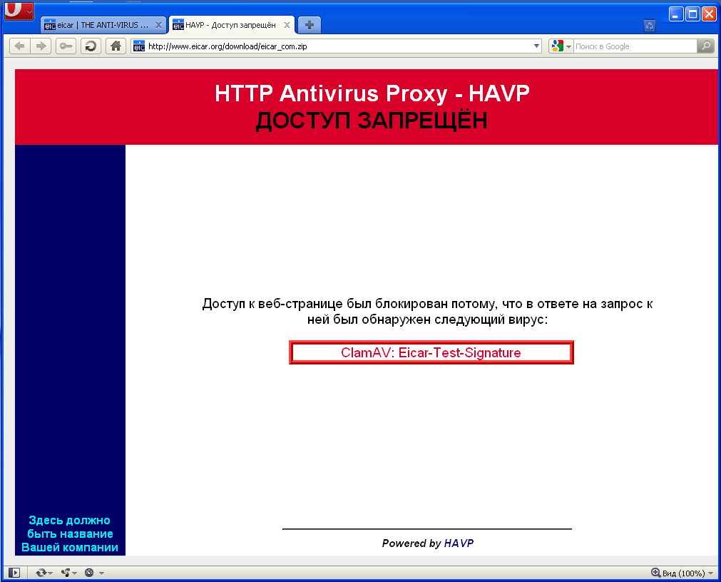 Теперь с клиентского ПК заходим на эту страничку и пробуем скачать тестовый вирус (не опасен, представляет собой специальную сигнатуру для проверки антивирусного ПО). Если все настроено правильно мы должны увидеть следующую страничку: