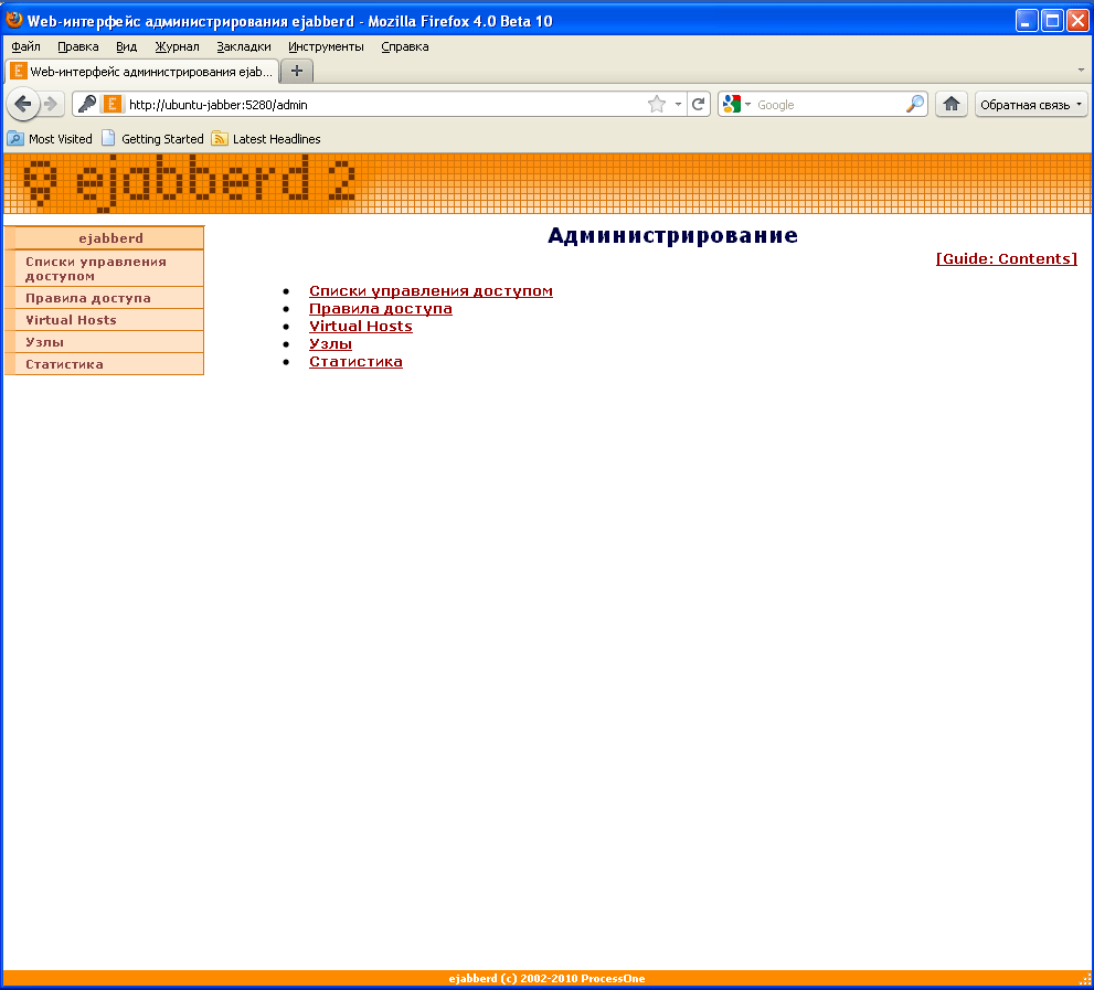 Для администрирования сервера можно использовать веб-админку, которая доступна по адресу: http://SERVER_NAME:5280/admin и позволяет решать ежедневные задачи администрирования без обращения к файлам конфигурации.