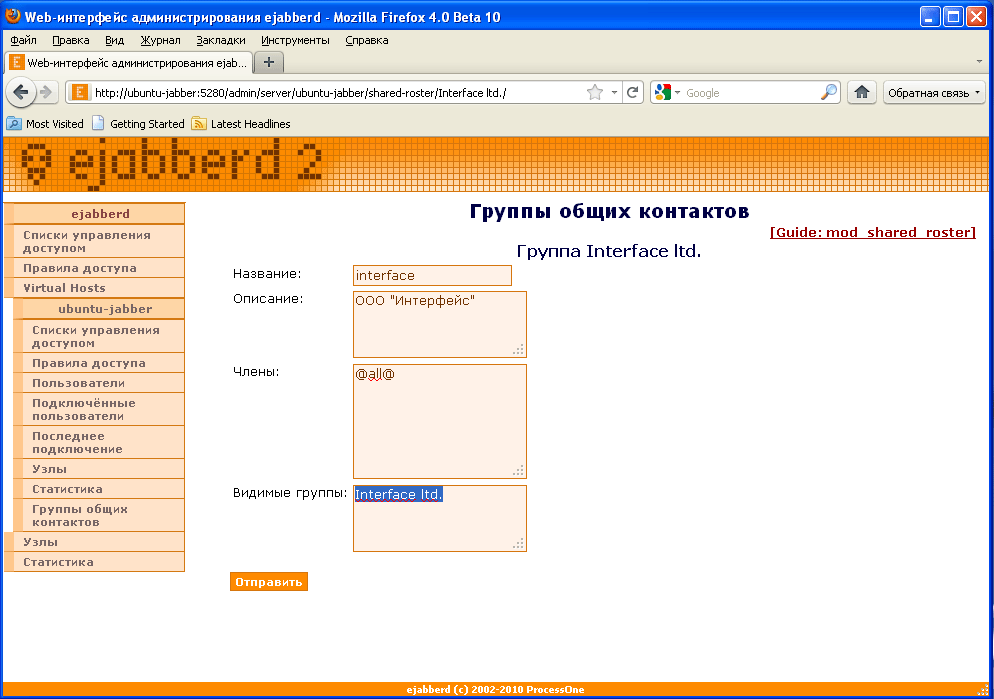 Сохраняем файл, перезапускаем сервис. Теперь в веб-админке в разделе Virtual Hosts - Имя вашего сервера появился пункт Группы общих контактов. Создаем такую группу и настраиваем как показано ниже: