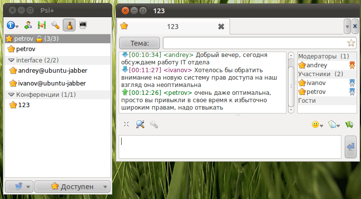 В качестве jabber-клиента мы используем Psi, кроссплатформенный клиент с богатыми возможностями, хотя вы можете выбрать то, что вам больше понравиться, благо есть из чего - список клиентов достаточно велик.