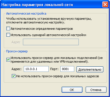 Для проверки настроим браузер клиентского компьютера на использование прокси-сервера 10.0.0.1:8081