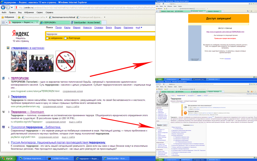 Попробуем посетить сайты с сомнительным контентом. Мы решили набрать в Яндексе поисковый запрос "терроризм" и походить по ссылкам. Фильтр пропустил статью на Википедии, но в то-же время заблокировал статью на стороннем сайте вполне корректного содержания, сыграло роль слишком частое употребление слова "терроризм" в тексте страницы.