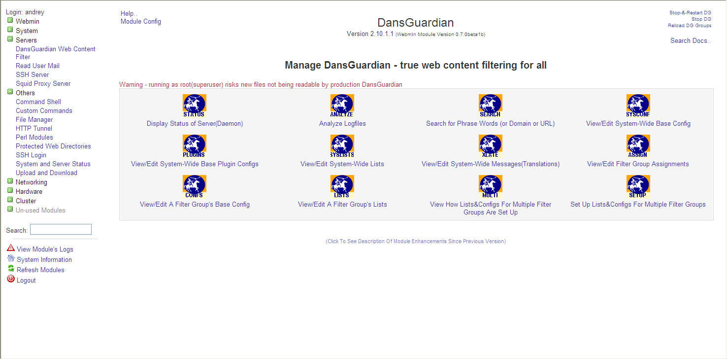 Для управления DansGuardian нам нужен соответствующий модуль для Webmin, скачать его можно с сайта разработчиков, на момент написания статьи актуальной была версия 0.7.0beta1. Установим его через закладку Модули Webmin, теперь он будет доступен в разделе Службы.