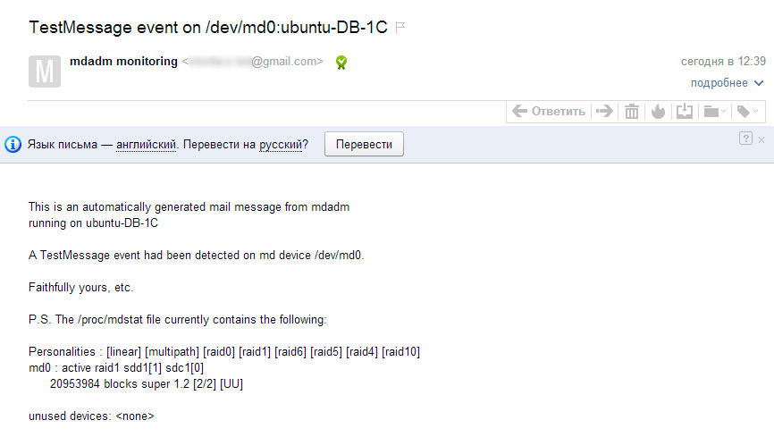 Как видим, настройка уведомлений о состоянии программного RAID-массива в Ubuntu Server предельно проста и не занимает много времени, в тоже время позволяет администратору держать руку на пульсе и своевременно реагировать на возникающие проблемы.