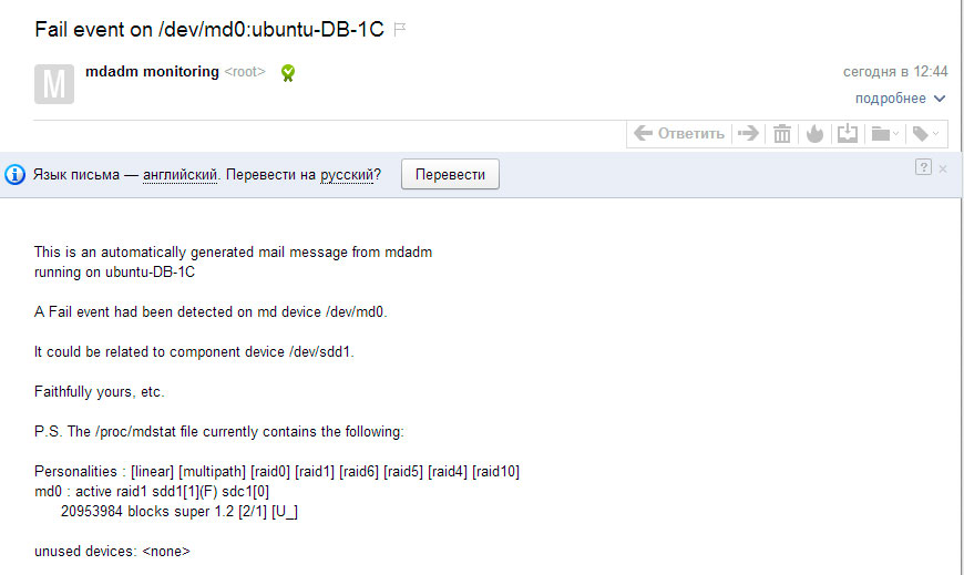В случае возникновения проблем с массивом mdadm будет посылать вам сообщения с подробным описанием ошибки. Для теста мы пометили один из дисков как сбойный и исключили его из массива. Практически моментально на почту пришло следующее сообщение:
