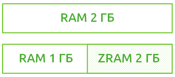 А теперь о том, откуда берется дополнительная память и в чем выгода от использования zRam. Официальная документация предлагает ориентироваться на коэффициент сжатия памяти от 1:2 д 1:3, хотя на практике могут быть и более высокие результаты. Давайте возьмем самый слабый сценарий 1:2 и посмотрим, что у нас получится. Допустим у системы есть 2 ГБ физической памяти, полностью созданный и заполненный zRam такого же размера займет всего 1ГБ, таким образом у системы останется 1 ГБ физической памяти и добавится 2 ГБ практически столь же быстрой подкачки. Т.е. мы как-бы расширили размер оперативной памяти до 3 ГБ, пусть и за счет некоторого снижения скорости доступа и увеличения нагрузки на процессор.