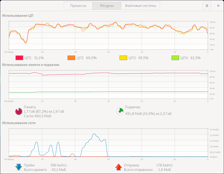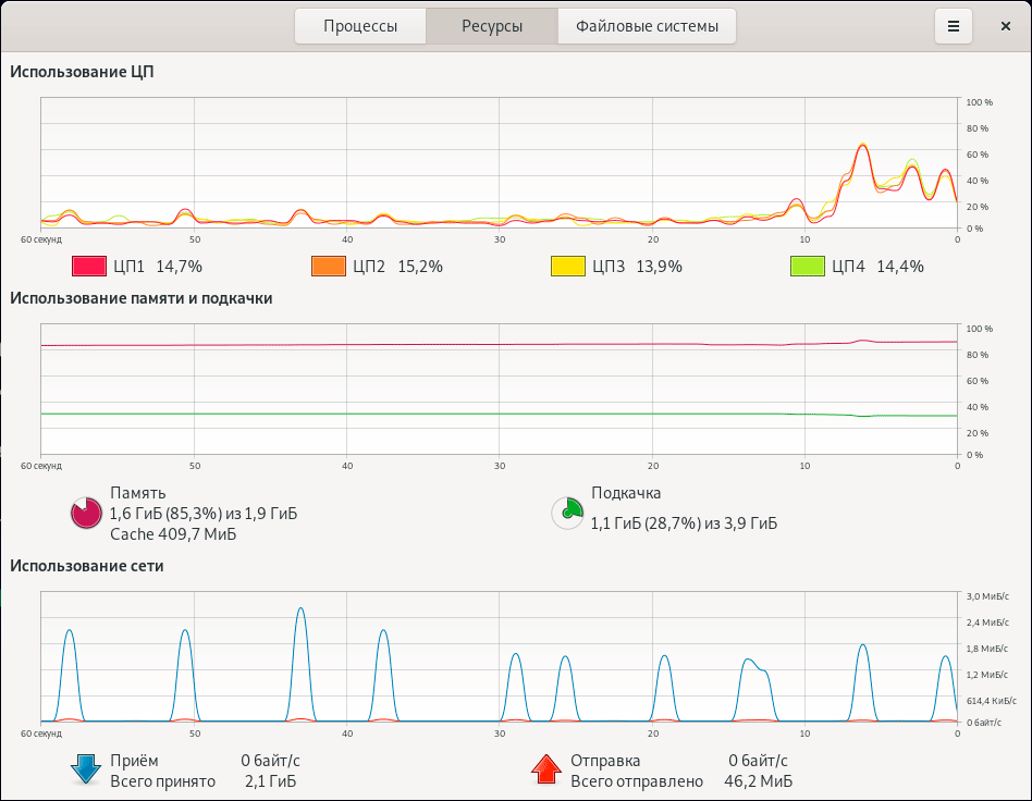 Как видим, система стала гораздо активнее свопить, но быстродействие ее от этого не ухудшилось, даже наоборот, так как процессы, которым действительно нужна память, теперь ее практически сразу получают за счет более агрессивного использования пространства подкачки.