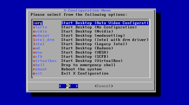Установка начинается с текстового режима, в котором предлагается выбрать используемый видеодрайвер, выбор довольно велик, но в нашем случае неплохо справилась и автоматическая конфигурация.