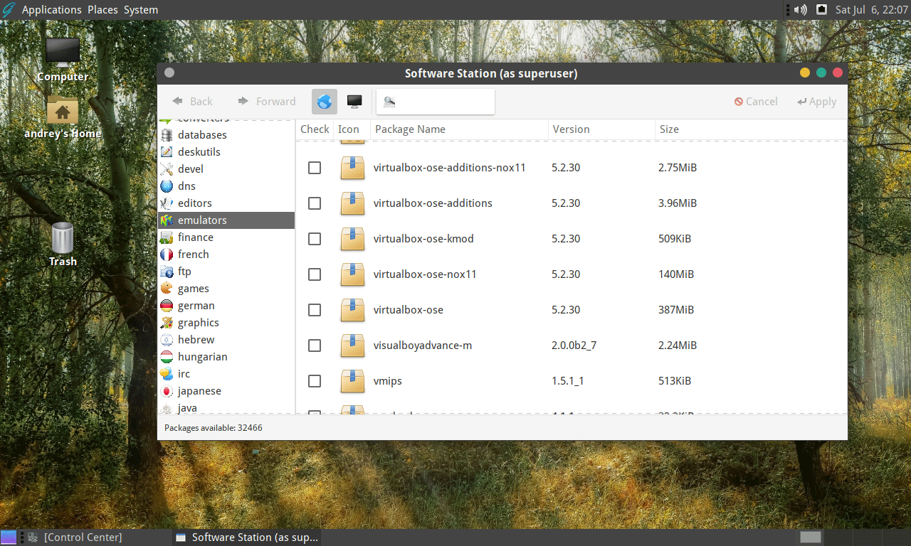 Какого-либо подобия графической оболочки пакетного менеджера нет. Хорошо если вы знаете имя пакета, который вам нужен, найти по описанию или просто просмотреть список пакетов, скажем для работы с видео, здесь не получится. С поддержкой виртуализации тоже все туго. Если любой современный Linux в среде VMWare или VirtualBoх чувствует себя отлично, позволяя использовать средства интеграции, аппаратное ускорение графики и прочие радости жизни, то здесь всего этого нет. Увидел все виртуальное железо - и хорошо. Автоматически подогнать экран под размер виртуалки? Нет, не слышали...
