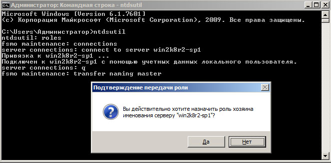 После того как мы подтвердим захват ntdsutil попытается осуществить операцию передачи роли и только в случае ее невозможности произведет захват.