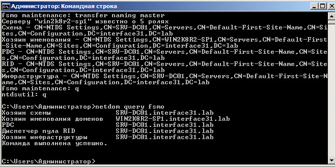 Теперь представим, что сервер WIN2K8R2-SP1 безвозвратно выбыл из строя и нам требуется захватить роль хозяина именования назад. Для захвата ролей служит команда seize, которая имеет аналогичный синтаксис.