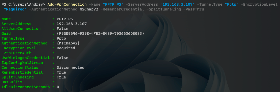 1Add-VpnConnection -Name "PPTP PS" -ServerAddress "192.168.3.107" -TunnelType "Pptp" -EncryptionLevel "Required" -AuthenticationMethod MSChapv2 -RememberCredential -SplitTunneling -PassThru