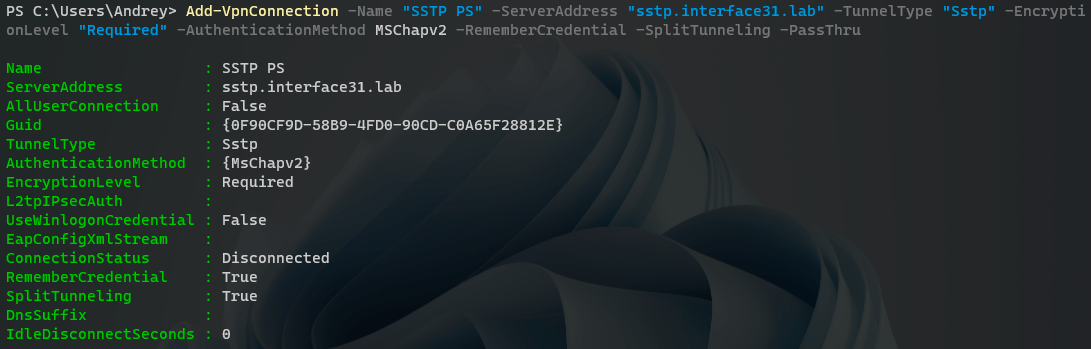1Add-VpnConnection -Name "SSTP PS" -ServerAddress "sstp.interface31.lab" -TunnelType "Sstp" -EncryptionLevel "Required" -AuthenticationMethod MSChapv2 -RememberCredential -SplitTunneling -PassThru