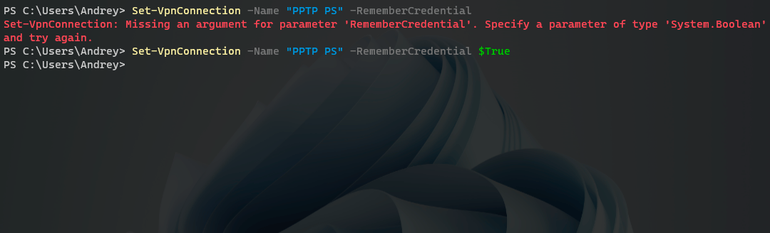 Немного сложнее с параметрами, использующими булево значение, такими как RememberCredential и аналогичными. Командлет Add-VpnConnection считал, что если параметр указан, то его значение - True или Истина (логическая 1), иначе - False или Ложь (логический 0). С Set-VpnConnection такой фокус не проходит, если мы просто укажем параметр, то он не поймет, чего именно мы от него хотим и выдаст сообщение об ошибке. Значение параметра потребуется указать явно.