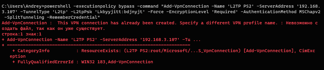 1powershell -executionpolicy bypass -command "Add-VpnConnection -Name 'L2TP PS2' -ServerAddress '192.168.3.107' -TunnelType 'L2tp' -L2tpPsk 'MySharedKey' -Force -EncryptionLevel 'Required' -AuthenticationMethod MSChapv2 -SplitTunneling -RememberCredential"