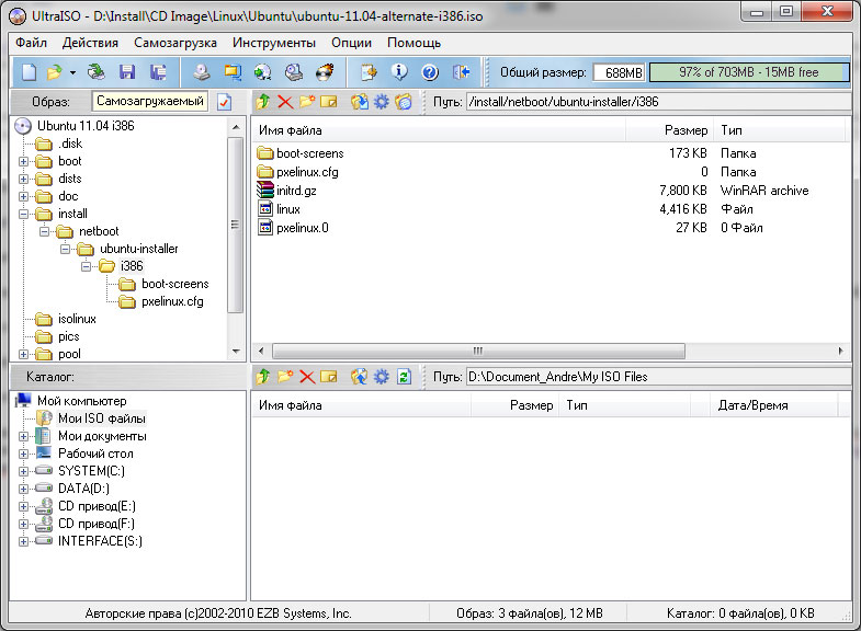 Будьте внимательны, не перепутайте файл с одноименной символической ссылкой, имеющей нулевой размер. Затем создайте две папки, скажем i386 и amd64, где будут размещаться загрузочные образы для разных архитектур. В каждый из них скопируйте файлы linux и initrd.gz с дисков соответствующих архитектур.
