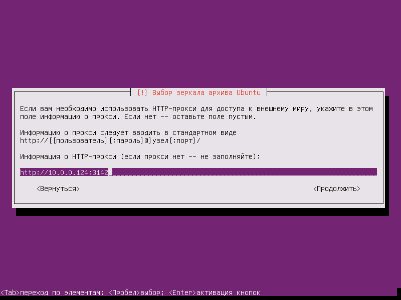 После того как вы выберете зеркало для загрузки файлов, система предложит вам указать прокси. Здесь мы вводим http://10.0.0.124:3142 - адрес и порт на которых работает apt-cacher-ng, это позволит не скачивать второй раз одни и те же пакеты и избавит от необходимости прописывать службу кэширования пакетов в /etc/apt/apt.conf на рабочих станциях.