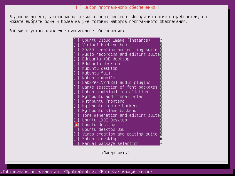 Следующий раз наше внимание понадобится при выборе устанавливаемого ПО. Здесь, кроме Ubuntu Desktop, рабочего стола по умолчанию (Unity), можно выбрать Kubuntu, Xubuntu, LXDE и т.п., получив на выходе установку соответствующей версии Ubuntu, или выбрать сразу несколько рабочих столов и выбирать их перед входом в систему. Также сразу можете выбрать иное необходимое ПО, хотя никто не мешает установить его позже.