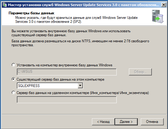 WSUS может хранить обновления в собственной БД или использовать SQL-сервер, последнее более предпочтительно с точки зрения производительности. Если в вашей сети уже развернут SQL-сервер можно использовать его, иначе вполне подойдет бесплатный SQL Express.