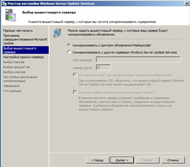 Сразу после установки запустится мастер начальной настройки. Все опции довольно просты и понятны. В параметрах синхронизации указываем откуда наш сервер будет получать обновления: с сервера Microsoft или с другого WSUS сервера. Последний вариант следует использовать если вам требуется развернуть дополнительный сервер обновлений, например, для филиала. В этом случае подчиненный сервер будет получать только одобренные вами обновления.