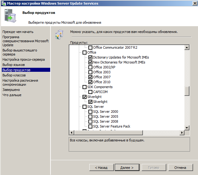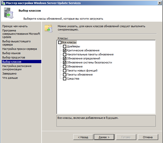 На следующей странице укажите какие классы обновлений вы хотели бы получать, здесь все зависит от политики обновлений на вашем предприятии. Следует помнить, что обновления драйверов и пакеты новых функций крайне не рекомендуется разворачивать автоматически, без предварительного тестирования. Если у вас нет возможности этим заниматься, то указывать эти классы вам ни к чему.