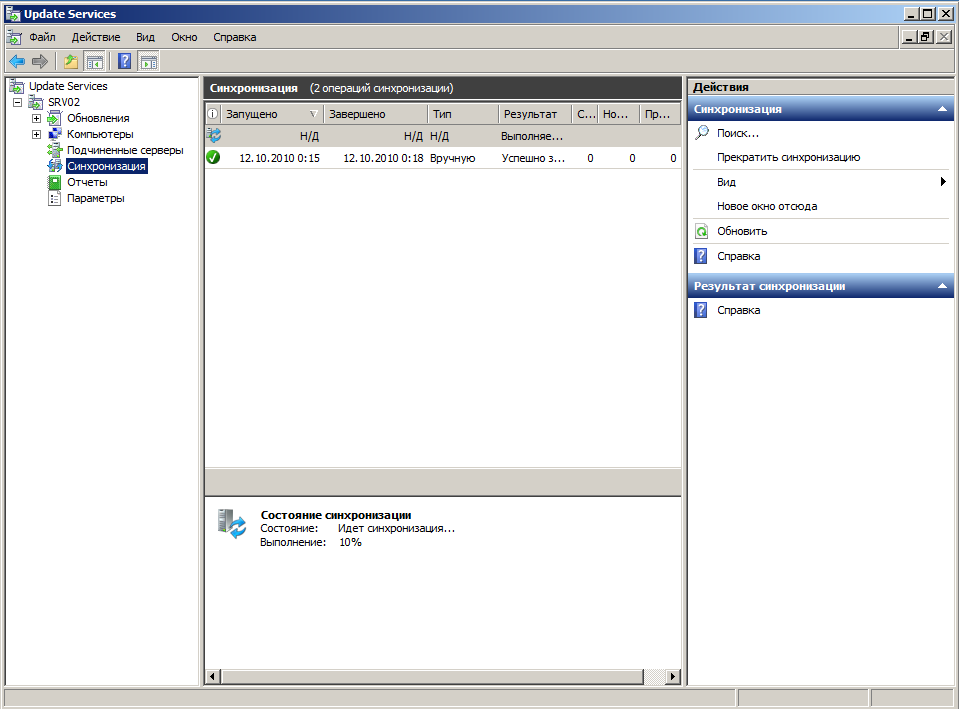 Открыв консоль (доступна в меню Администрирование), первым делом запустите ручную синхронизацию, чтобы скачать все имеющиеся на сегодняшний день обновления для выбранных продуктов. В зависимости от того, чего и сколько вы выбрали при настройке, а также скорости вашего подключения это может занять продолжительное время.