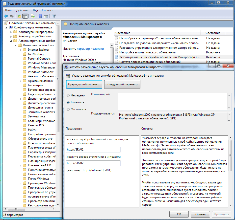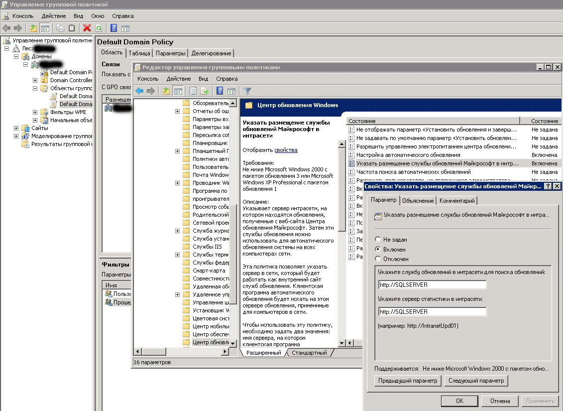 Пока идет синхронизация займемся настройкой клиентских ПК. Если у вас развернута Active Directory это можно сделать с помощью групповых политик. Откройте Управление групповой политикой, выберите необходимый объект и щелкнув правой кнопкой мышки нажмите Изменить. В открывшемся окне выберите Конфигурация компьютера - Политики - Административные шаблоны - Центр обновления Windows. Нас интересует параметр Указать размещение службы обновлений Microsoft в интрасети. Переводим его в положение Включено и указываем путь к нашему WSUS серверу в виде http://ИМЯ_СЕРВЕРА.
