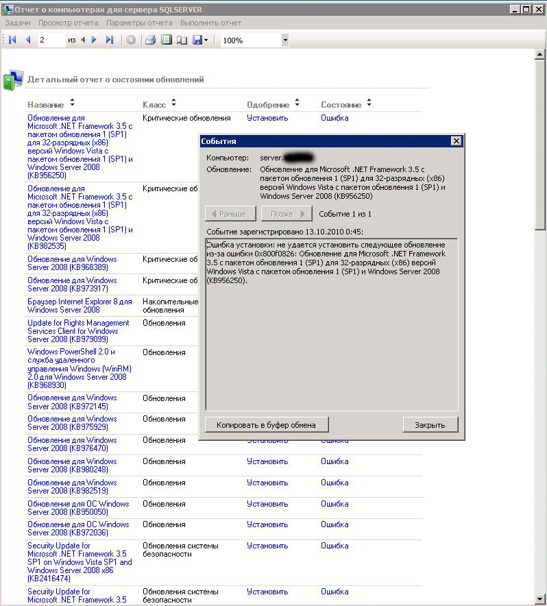 Информации вполне достаточно, чтобы быстро оценить общую ситуацию и обратить внимание на проблемные места. Красные крестики указывают на то, что на данных ПК произошли ошибки в обновлении, с каждым таким случаем надо разбираться в отдельности. По каждому обновлению формируется детальный отчет, содержащий все необходимые для анализа проблемы данные.