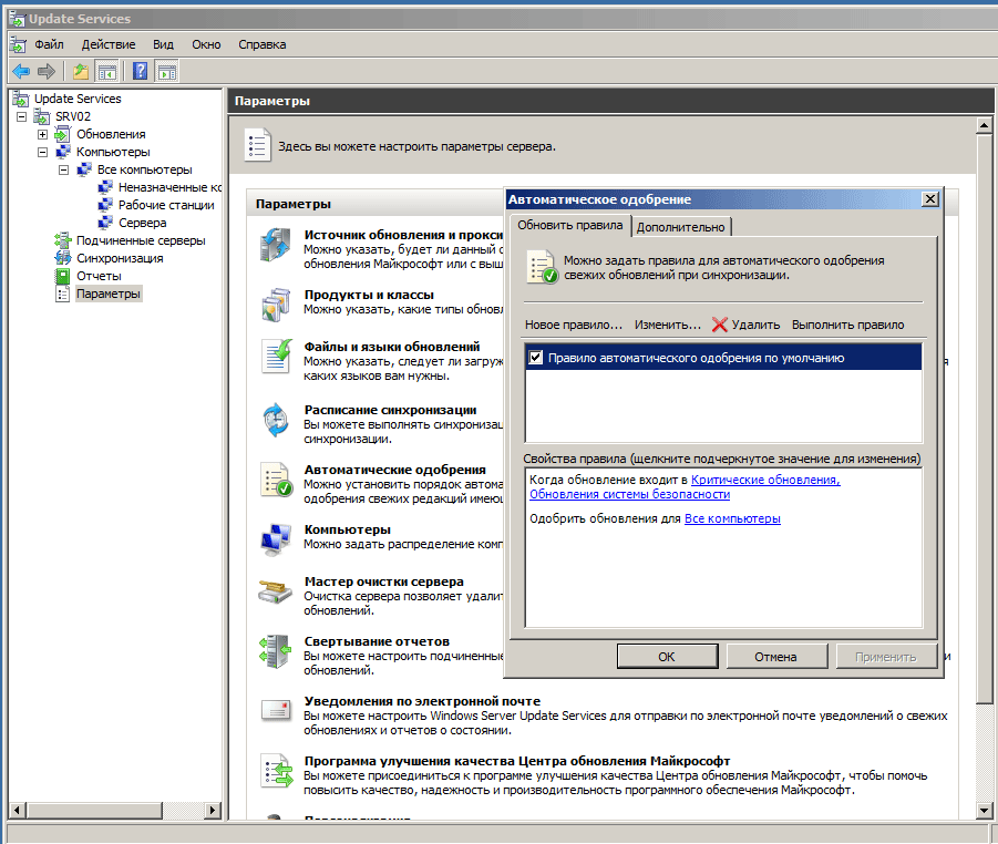 Вот мы и подошли к еще одной важной настройке сервера - автоматическом одобрении. Клиентские ПК могут получать только одобренные обновления, но каждый раз делать все вручную нереально, поэтому часть обновлений можно одобрять автоматически. Откроем Параметры - Автоматические одобрения и активируем уже имеющуюся там политику, которая позволяет автоматически устанавливать критические обновления и обновления безопасности.