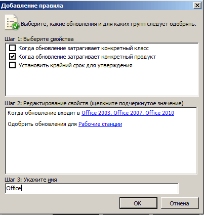 Здесь вы можете создавать свои правила и назначать их любой группе ПК. Например мы создали правило: автоматически одобрять все обновления MS Office группы Рабочие станции.