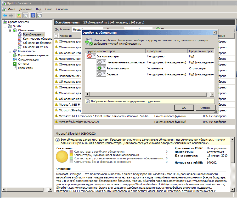 Просмотреть все доступные обновления можно в разделе Обновления, здесь же можно одобрять их вручную. Мы рекомендуем завести один или несколько тестовых ПК (можно виртуальных) и тестировать на них обновления и пакеты новых функций и только после этого одобрять обновления для установки. Одобрить обновления можно как для всех ПК, так и для группы, в качестве примера мы одобрили установку пакета Silverlight для группы Рабочие станции.